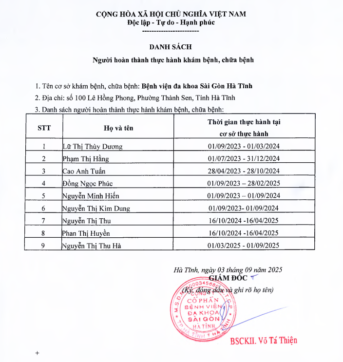 Danh sách người hoàn thành thực hành khám bệnh, chữa bệnh tại Bệnh viện Đa khoa Sài Gòn Hà Tĩnh 03/09/2025